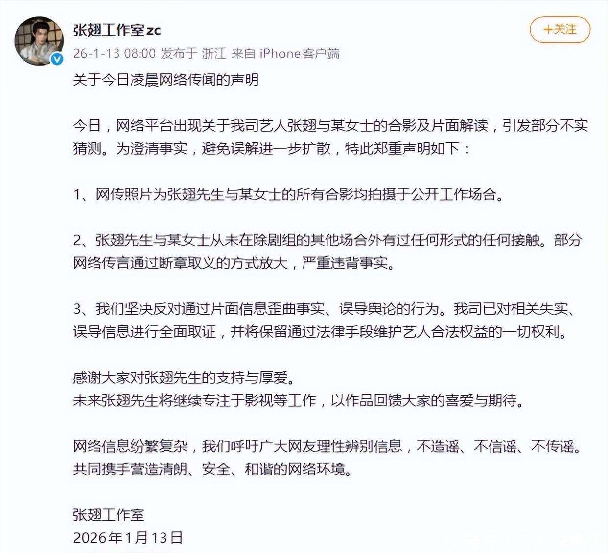 就在网友忙着“破案”时,张翅方面的响应号称“光速”。本日上昼八点,一个刚刚注册的责任室账号进击发布声明,试图扑灭这场燎原之火。声明中枢就三点:统统相片齐是剧组公开处所拍的;两东说念主在戏外“零斗殴”;也曾取证,准备法律维权。一套否定三连,试图将相关定性为地说念的“共事一场”。