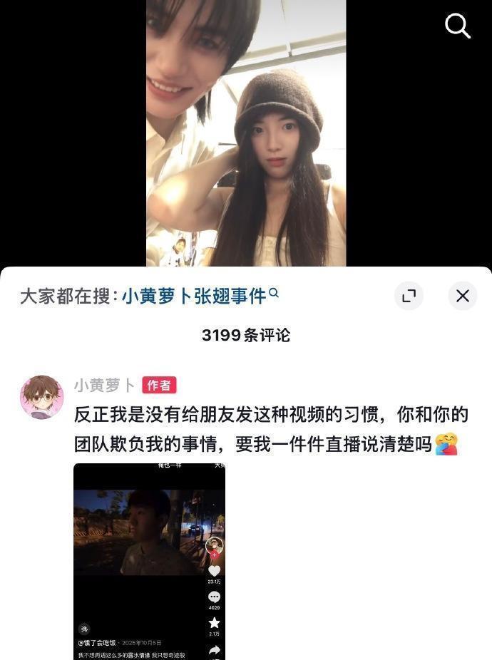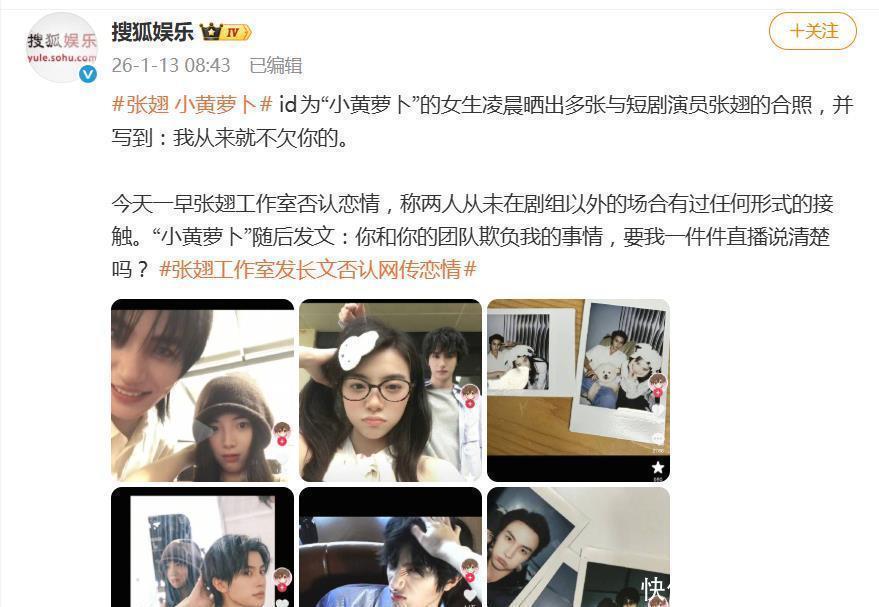 1月13日凌晨三点,当大遍及东说念主还在睡梦中时,抖音网红“小黄萝卜”蓦地甩出22张与演员张翅的合照,并配上一句苦心婆心的“我从来就不欠你的”。相片可不是纯粹的同框——从片场摩肩接毂的互动、暗里探班的合影,到聚餐合照乃至车内看似亲昵的肢体斗殴,时代线拉得颇长,定位傲气在上海。这波操作顷刻间焚烧了吃瓜大家的神经,驳斥区里,“替你瞒了这样久,最终照旧be了”这类粉丝留言,以及歌手蓝心羽等网红好友的劝慰,齐仿佛在盖印认证:这曾是一段秘而不宣的恋情,且如今已透顶撕破脸。