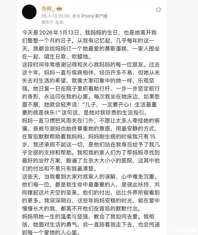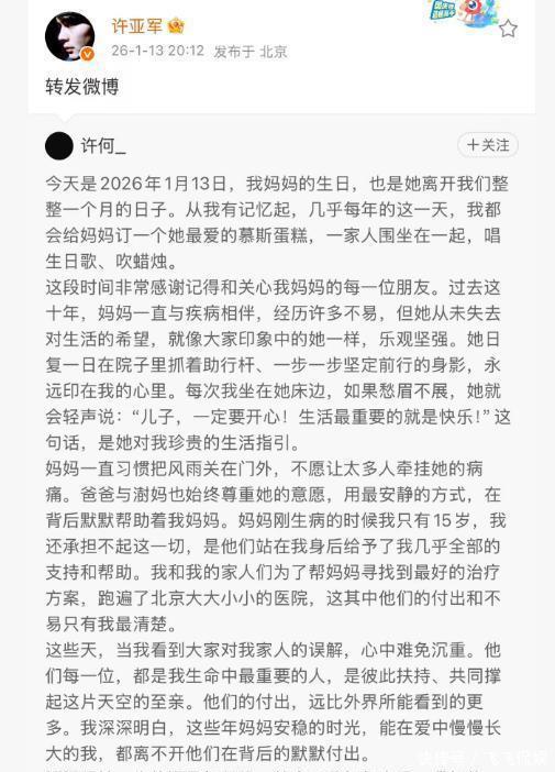 1月13日是何晴的冥诞,何晴的犬子许何写长文诅咒母亲,同期,也在文中替许亚军分解了一些不好的公论与估计。长文执行如下: